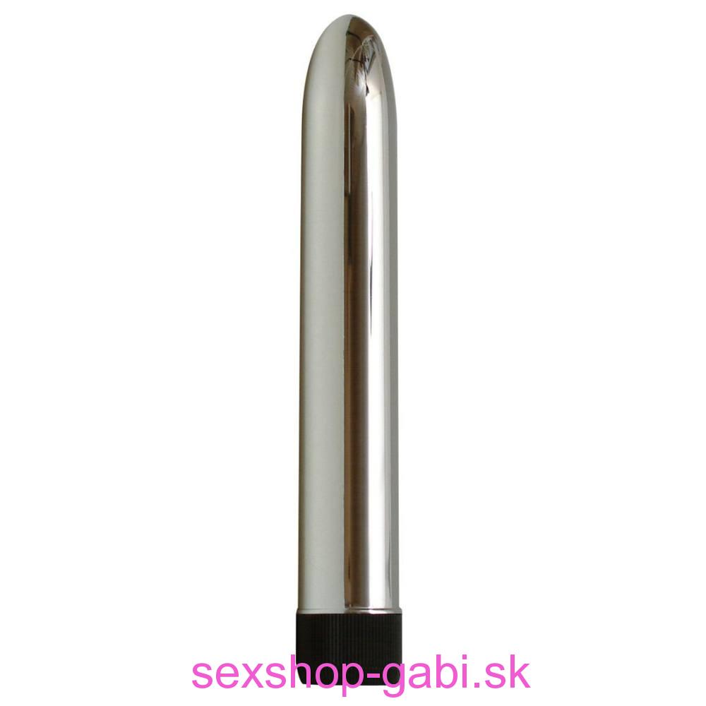 Tyčový vibrátor z lesklého, pevného materiálu, s vynikajúcou schopnosťou viesť vibráciu a s nastaviteľnou silou vibrácie - od nežnej až po silnú. Lesklý vibrátor striebornej farby. Dĺžka 17,5 cm, priemer 2,5 cm.