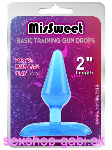 Anal Plug MisSweet Basic Training Gun kolík v transparentnej modrej je vyrobený z transparentného modrého klzkého materiálu: PVC, z netoxického elastoméru vhodného pre pokožku.